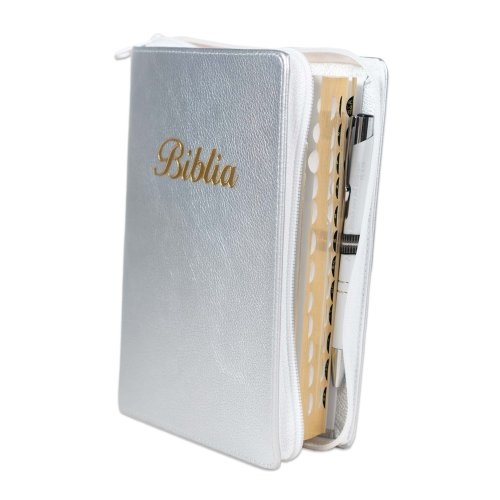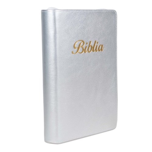 Biblia marime medie, culoare argintie, piele, fermoar, margini aurii, index, cuv. lui Isus cu rosu [MAR 057 PFI]