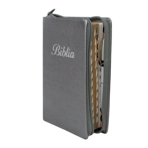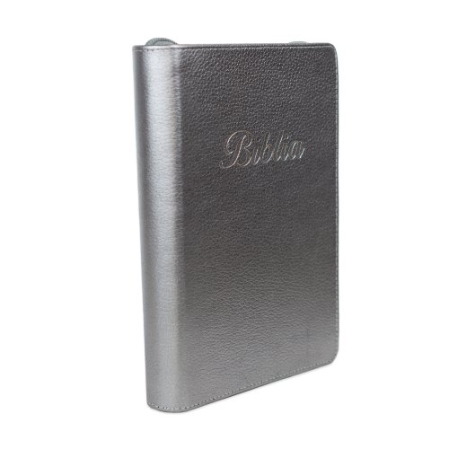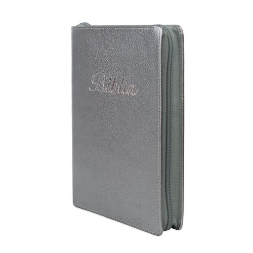 Biblia marime medie, culoare argintiu, piele, fermoar, margini aurii, index, cuv. lui Isus cu rosu + pix [MAR 057 PFI]