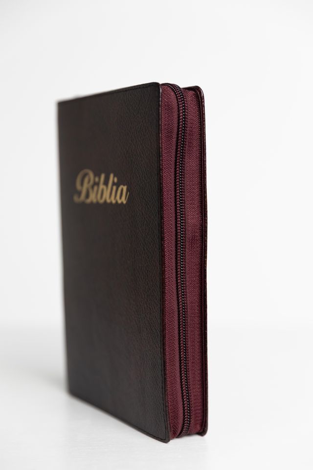Biblia marime medie, culoare bordo închis, piele, fermoar, margini, aurii, index, cuv. lui Isus cu rosu + pix [MAR 057 PFI]