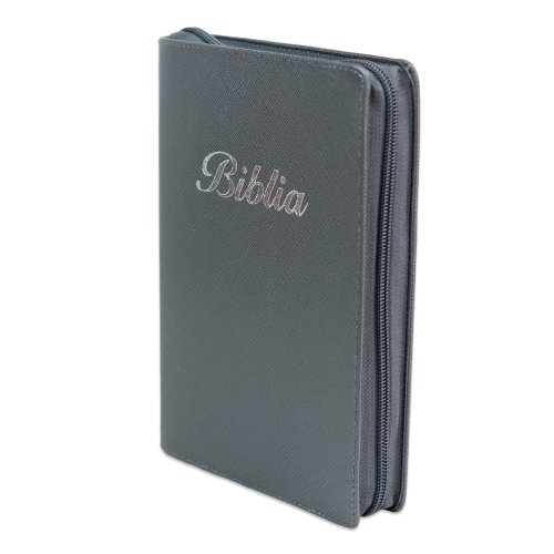 Biblia marime medie, culoare gri texturat, piele, fermoar, margini aurii, index, cuv. lui Isus cu rosu [MAR 057 PFI]