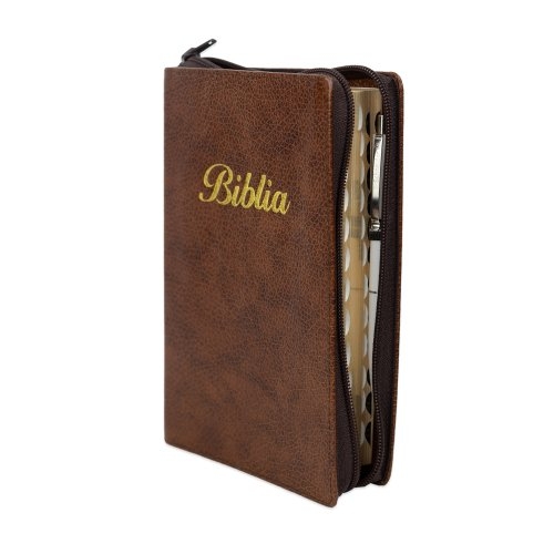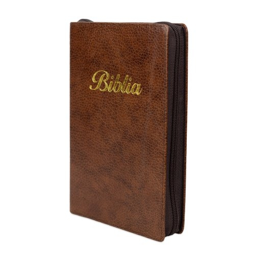Biblia marime medie, culoare maro, piele, fermoar, margini aurii, index, cuv. lui Isus cu rosu [MAR 057 PFI]