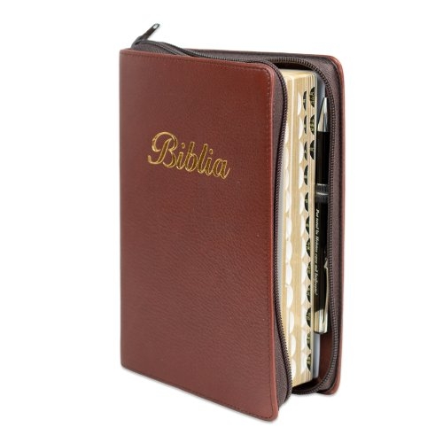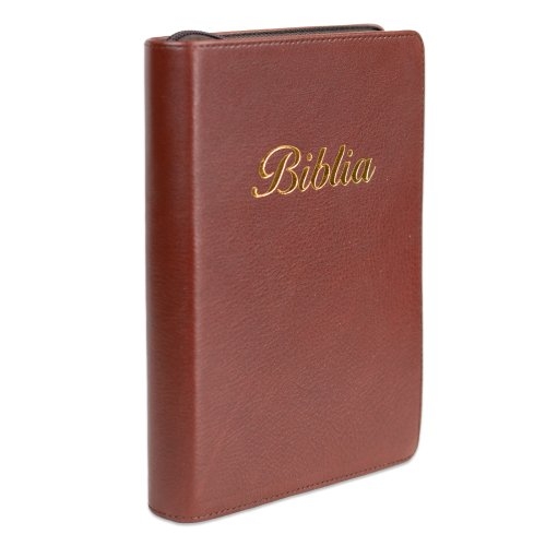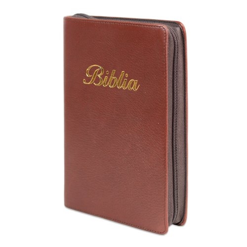 Biblia marime medie, culoare maro roscat, piele, fermoar, margini aurii, index, cuv. lui Isus cu rosu + pix [MAR 057 PFI]