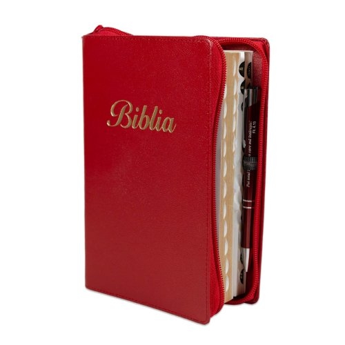 Biblia marime medie, culoare rosie, piele, fermoar, margini aurii, index, cuv. lui Isus cu rosu + pix [MAR 057 PFI]