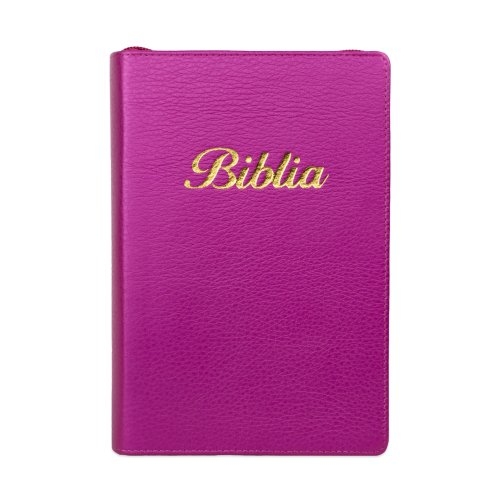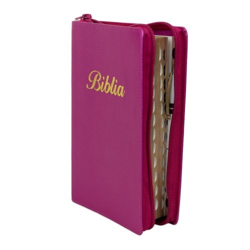 Biblia marime medie, culoare roz, piele, fermoar, margini aurii, index, cuv. lui Isus cu rosu [MAR 057 PFI]