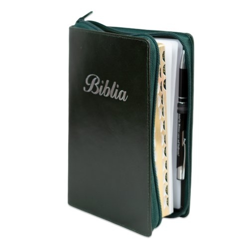Biblia marime medie, culoare verde inchis, piele, fermoar, margini aurii, index, cuv. lui Isus cu rosu [MAR 057 PFI]