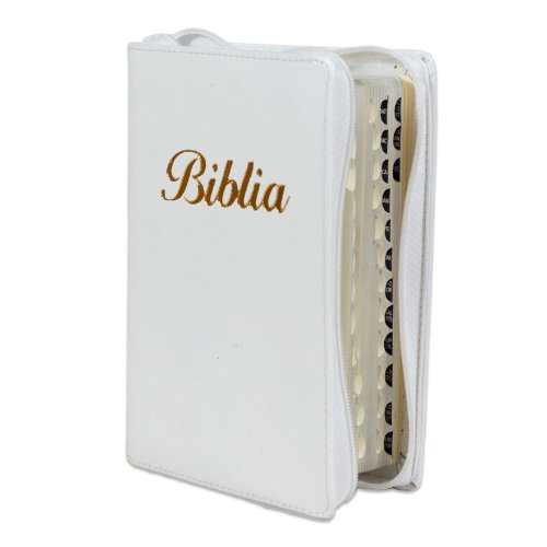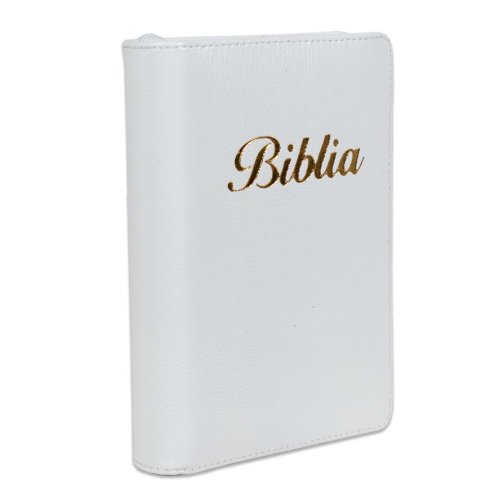 Biblia marime mica, alba, piele, fermoar, margini argintii, index, cuv. lui Isus cu rosu [047 PFI]