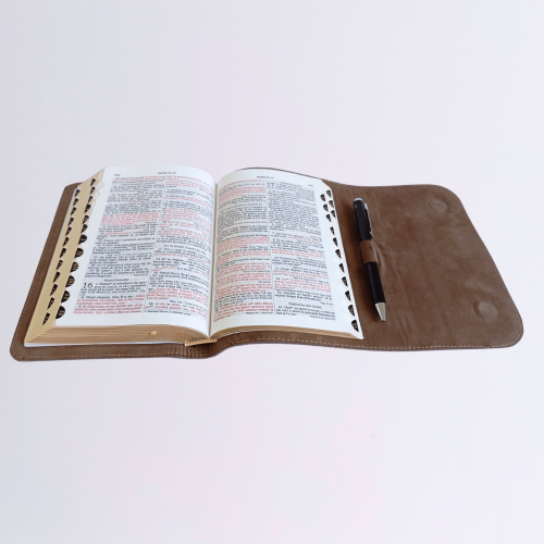 Biblia marime medie, maro brun, piele, inchidere clapeta cu magnet, margini aurii, index, cuv. lui Isus cu rosu [MAR 057 PMI]