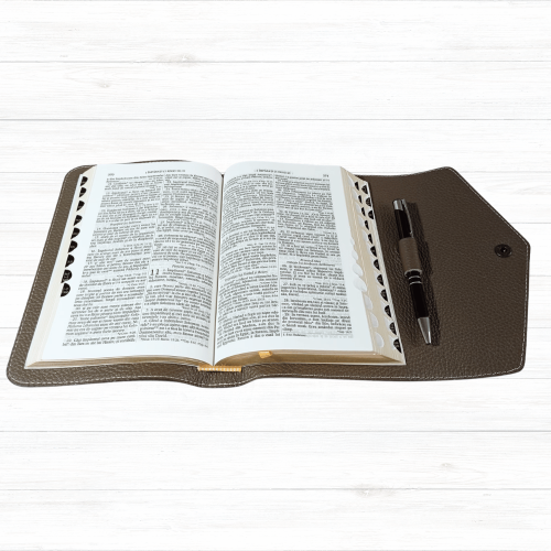 Biblia marime medie, maro, piele, inchidere clapeta cu capsa 2, margini aurii, index, cuv. lui Isus cu rosu [MAR 057 PCI]