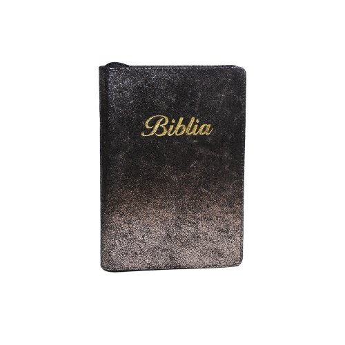 Biblia marime medie, neagra cu textura argintie, fermoar, margini aurii, index, cuv. lui Isus cu rosu [MAR 057 PFI]