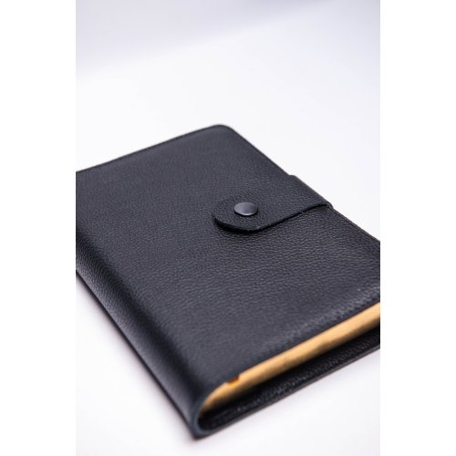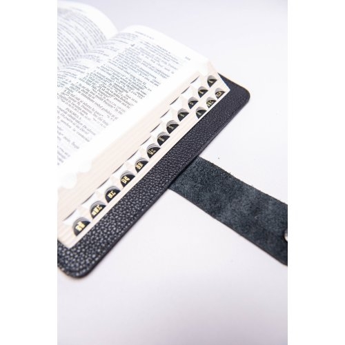 Biblia marime medie, neagră, piele, inchidere baretă cu capsa 2, margini aurii, index, cuv. lui Isus cu rosu [MAR 057 PCI]
