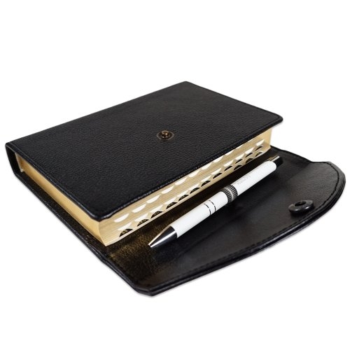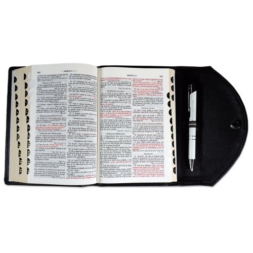 Biblia marime medie, neagra, piele, inchidere clapeta cu capsa 2, margini aurii, index, cuv. lui Isus cu rosu [MAR 057 PCI]