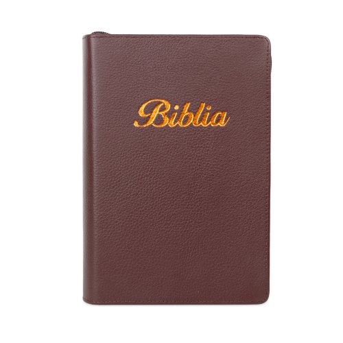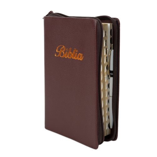 Biblia marime medie, visiniu, piele, fermoar, margini aurii, index, cuv. lui Isus cu rosu + pix [MAR 057 PFI]