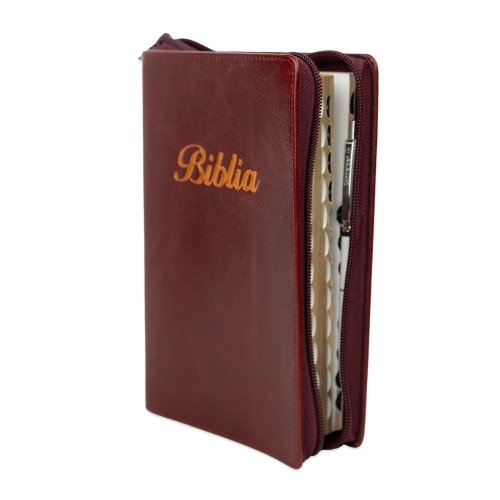 Biblia marime medie, visiniu, piele, fermoar, margini aurii, index, cuv. lui Isus cu rosu + pix [MAR 057 PFI]