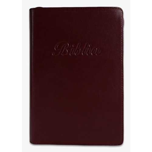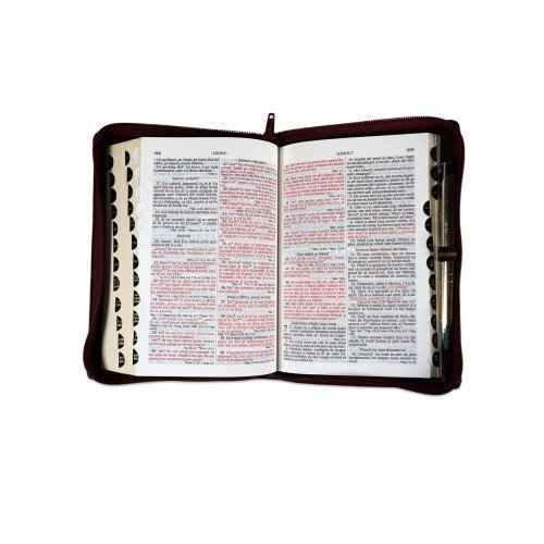 Biblia marime medie, visiniu, piele, fermoar, margini aurii, index, cuv. lui Isus cu rosu [MAR 057 PFI]
