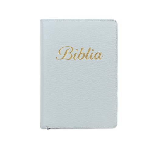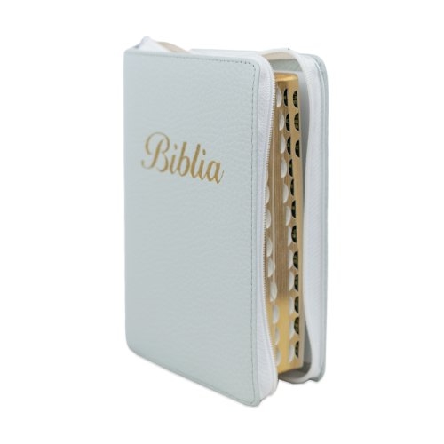 Biblia marime mica, albă, piele, fermoar, margini aurii, index, cuv. lui Isus cu rosu [047 PFI]