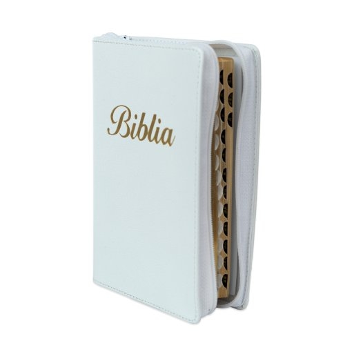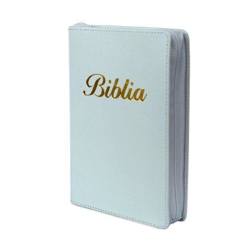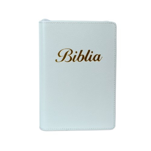 Biblia marime mica, alba, piele, fermoar, margini aurii, index, cuv. lui Isus cu rosu [047 PFI]