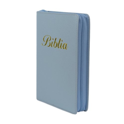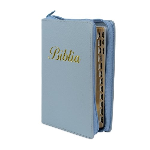 Biblia marime mica, albastru deschis, piele, fermoar, margini aurii, index, cuv. lui Isus cu rosu [047 PFI]