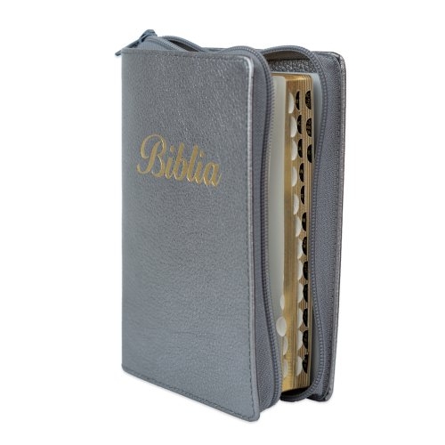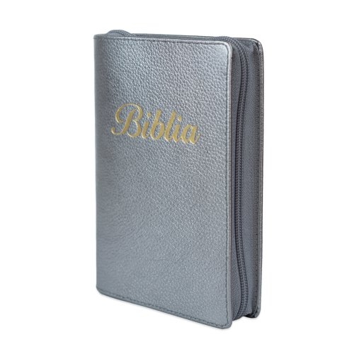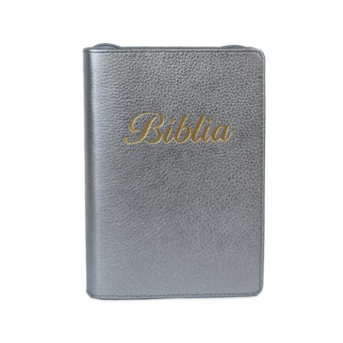 Biblia marime mica, argintiu, piele, fermoar, margini aurii, index, cuv. lui Isus cu rosu [047 PFI]