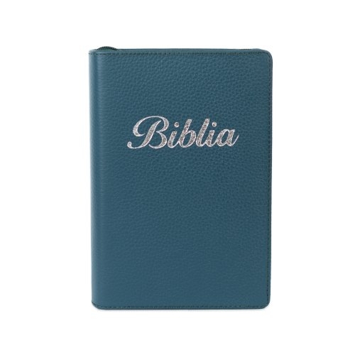 Biblia marime mica, nuanță de verde, piele, fermoar, margini aurii, index, cuv. lui Isus cu rosu [047 PFI]