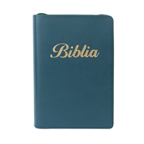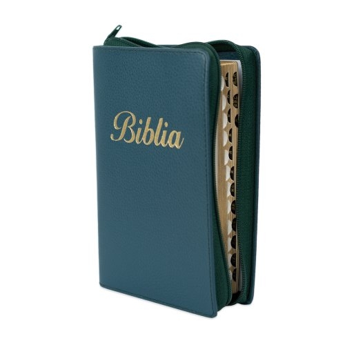 Biblia marime mica, nuanță de verde, piele, fermoar, margini aurii, index, cuv. lui Isus cu rosu [047 PFI]