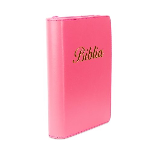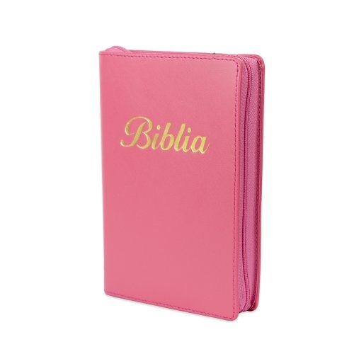 Biblia marime mica, roz, piele, fermoar, margini aurii, index, cuv. lui Isus cu rosu [047 PFI]