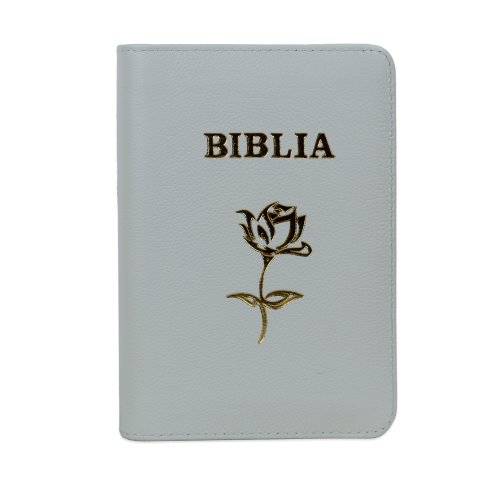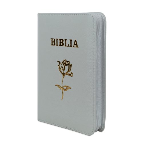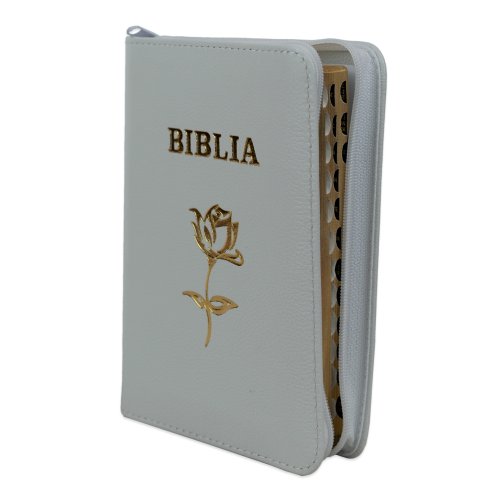 Biblia mica, coperta piele, albă, index, fermoar, margini aurii, simbol floral, cuv. lui Isus in rosu [047 PFI]