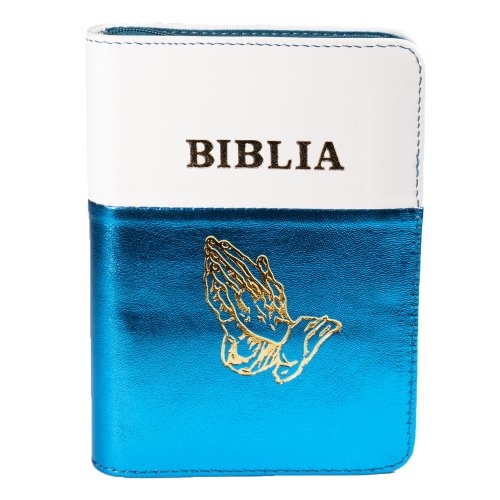 Biblia mica, coperta piele, culoare, alb cu albastru sidefat, index, fermoar, margini aurii, simbolul maini, cuv. lui Isus in rosu [047 PFI]