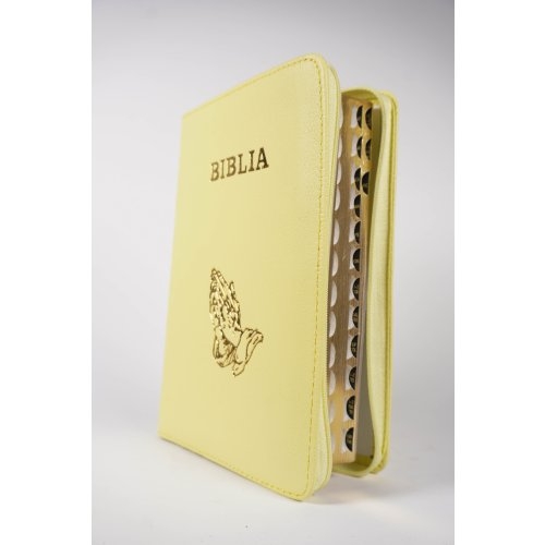 Biblia mica, coperta piele, culoare, galben, index, fermoar, margini aurii, simbolul maini, cuv. lui Isus in rosu [047 PFI]