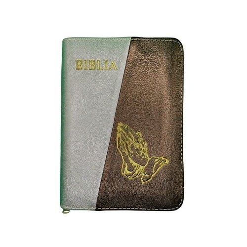 Biblia mica, coperta piele, culoare, gri sidefat cu maro sidefat, index, fermoar, margini aurii, simbolul maini, cuv. lui Isus in rosu [047 PFI]