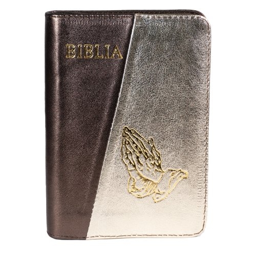 Biblia mica, coperta piele, culoare, maro închis sidefat cu auriu deschis sidefat, index, fermoar, margini aurii, simbolul maini, cuv. lui Isus in rosu [047 PFI]