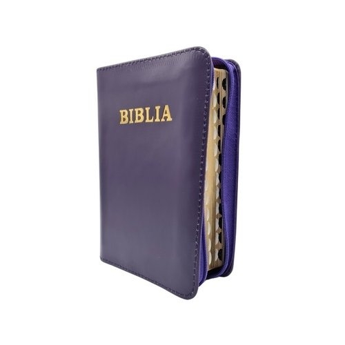 Biblia mica, coperta piele, culoare, mov, index, fermoar, margini aurii, cuv. lui Isus in rosu [047 PFI]