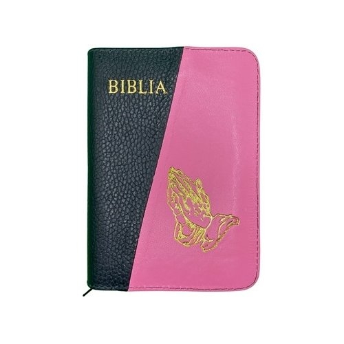 Biblia mica, coperta piele, culoare, negru cu roz, index, fermoar, margini aurii, simbolul maini, cuv. lui Isus in rosu [047 PFI]