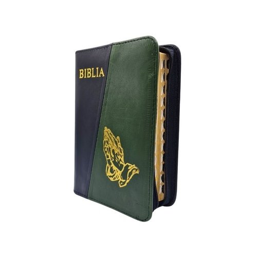 Biblia mica, coperta piele, culoare, negru cu verde oliv, index, fermoar, margini aurii, simbolul maini, cuv. lui Isus in rosu [047 PFI]