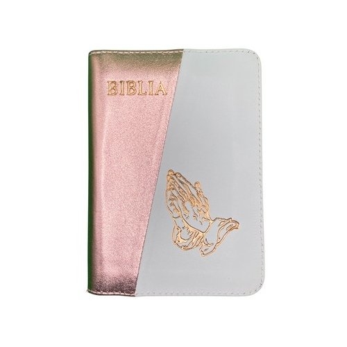 Biblia mica, coperta piele, culoare, roz sidefat cu alb, index, fermoar, margini aurii, simbolul maini, cuv. lui Isus in rosu [047 PFI]