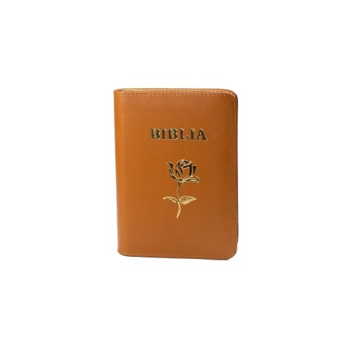 Biblia mica, coperta piele, maro, index, fermoar, margini aurii, simbol floral, cuv. lui Isus in rosu [047 PFI]
