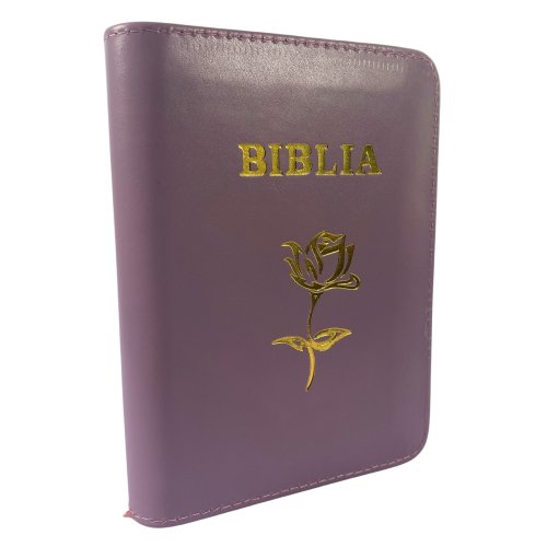 Biblia mica, coperta piele, mov deschis, index, fermoar, margini aurii, simbol floral, cuv. lui Isus in rosu [047 PFI]