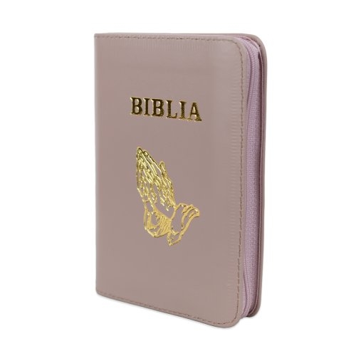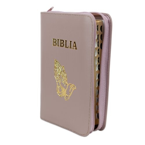 Biblia mica, coperta piele, mov deschis, index, fermoar, margini aurii, simbolul maini, cuv. lui Isus in rosu [047 PFI]