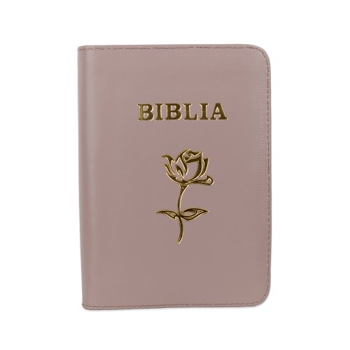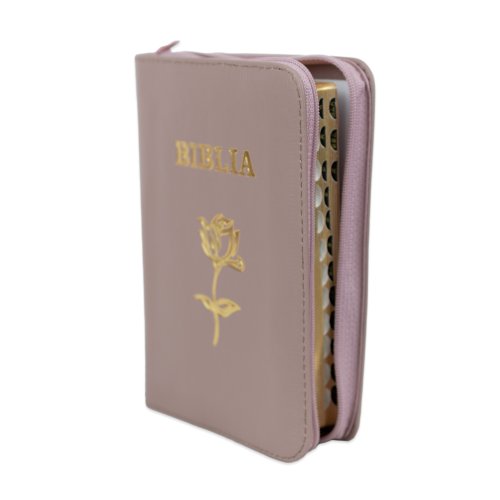 Biblia mica, coperta piele, roz plămâniu, index, fermoar, margini aurii, simbol floral, cuv. lui Isus in rosu [047 PFI]