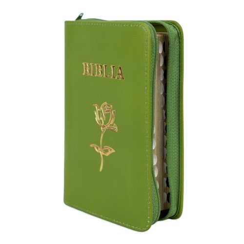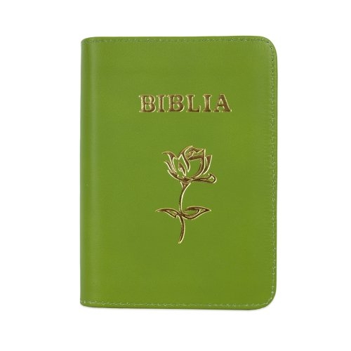 Biblia mica, coperta piele, verde oliv, index, fermoar, margini aurii, simbol floral, cuv. lui Isus in rosu [047 PFI]