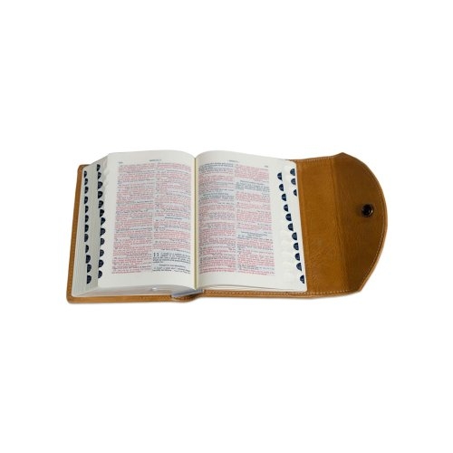 Biblia mica, din piele ,culoare maro, clapeta cu capsa, index, margini argintii, cuv. lui Isus in rosu .