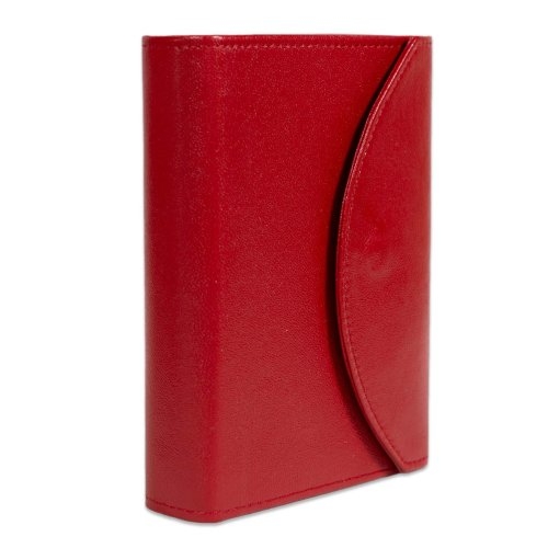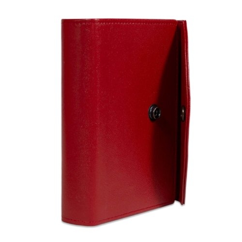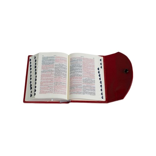 Biblia mica, din piele rosie, clapeta cu capsa, index, margini argintii, cuv. lui Isus in rosu .