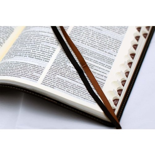operta din piele, in doua culori: negru si maro, este intregita de maiestria detaliata a cusaturilor ce maresc durabilitatea copertii si adauga un element subtil de stil aspectului general al Bibliei. Paginile cu margini argintate completeaza si mai mult designul, calitatea si stilul. Cotorul are titlul gravat prin presare, alaturi de logoul NTR.