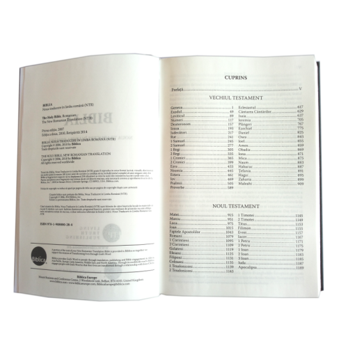 Biblia de faţă, intitulată Noua traducere a Bibliei în limba română (NTR), se doreşte a fi un instrument de informare şi studiu adaptat cerinţelor omului secolului XXI, un text potrivit pentru uzul liturgic şi personal deopotrivă, o nouă alternativă oferită atât celui implicat în slujirea din mediul eclesial, cât şi cititorului de rând, care nu deţine neapărat cunoştinţe avansate în materie de teologie. În eforturile de a realiza o traducere relevantă pentru vorbitorul de limbă română de astăzi, traducătorii au ţinut cont de inovaţiile limbii române actuale din domeniul lexicului, al terminologiilor, al tiparelor sintactice, al strategiilor de comunicare, folosind totodată şi termeni care, deşi există în uzanţa limbii române de câteva decenii, şi-au păstrat expresivitatea şi continuă să rămână potriviţi pentru un text sacru.