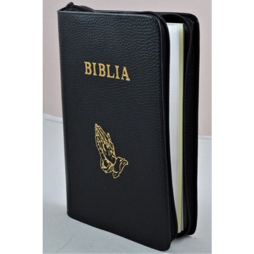 Biblia NTR (Noua Traducere), coperta piele, negru, simbol maini in ruga, fermoar, argintata - editia 3 revizuita