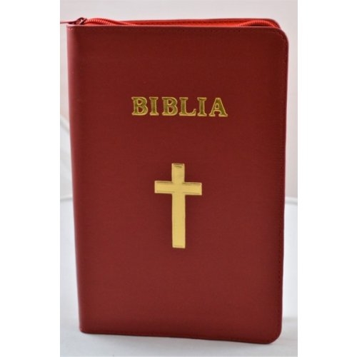Biblia NTR (Noua Traducere), coperta piele, rosie, simbol cruce, fermoar, argintata - editia 3 revizuita