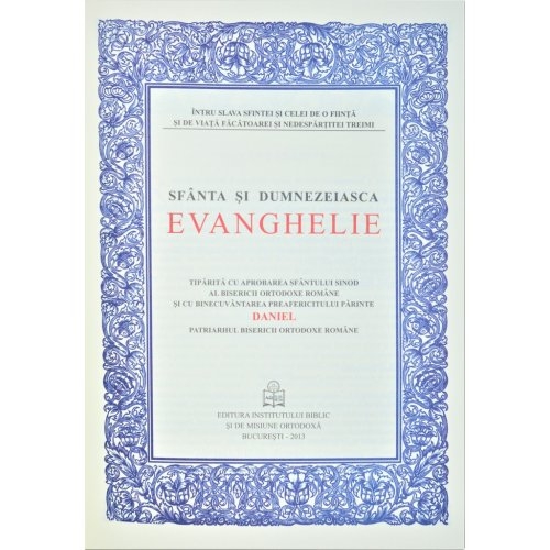 Ca și precedenta ediție din anul 2010, actuala „Sfântă Evanghelie”, Biblia Ortodoxă, urmează textul ultimei ediții a Sfintei Scripturi (2008) și este îmbogățită cu textele Evangheliilor consacrate Sfinților români care au slujbă aprobată de Sfântul Sinod.
