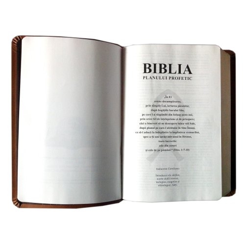 Biblia Planului Profetic, varianta de lux, traducerea D. Cornilescu, dimensiune mare (24 / 16 cm), maro, coperta din imitatie piele, aurita pe margini, cuvintele lui Isus scrise cu rosu.