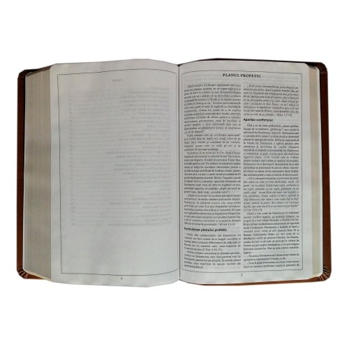 Biblia Planului Profetic, varianta de lux, traducerea D. Cornilescu, dimensiune mare (25.5 / 17 cm), maro inchis, coperta din piele, aurita pe margini, cuvintele lui Isus scrise cu rosu.