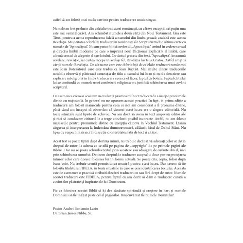 Aceasta biblie este rezultatul a peste zece ani de muncă, constând în zeci de mii de ore de studiu individual, traduceri, revizuiri, însoţite de agonie şi mulţumire. Noi credem că ţi-am înmânat în modul cel mai curat cu putinţă Cuvântul păstrat al lui Dumnezeu.
