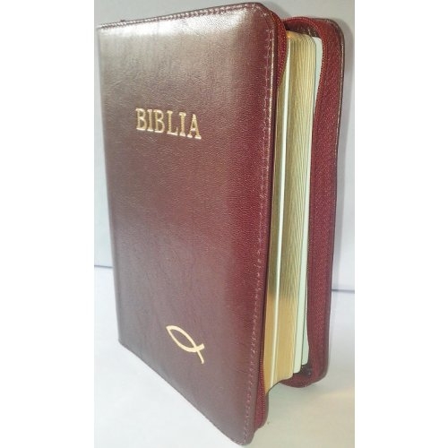 Biblie din piele, marime medie, visinie, fermoar, margini aurii, cu peste, cuv. Lui Isus cu rosu [052]